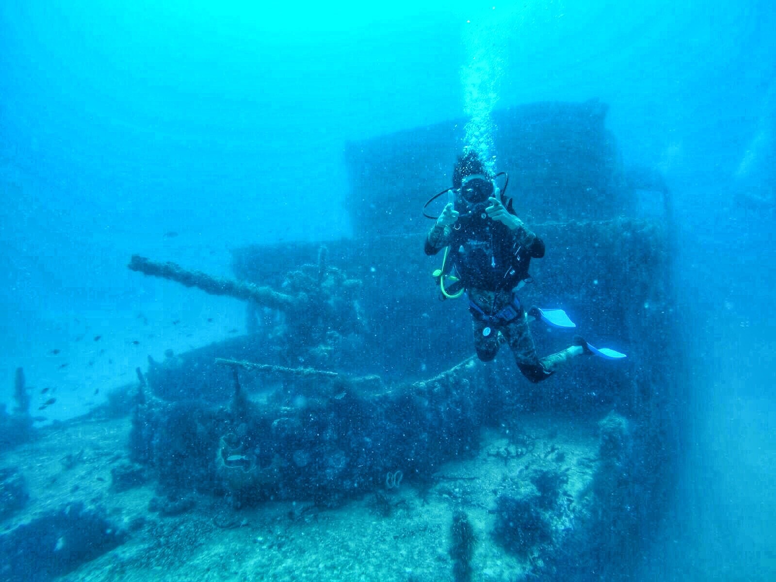 This 200-foot-long gunboat has 3 decks to explore: cabins, engine room and ammunition room. It is common to see on the upper deck Eagle Rays, Groupers, Snappers and several tropical fish. In the bottom you can find another specie of Ray.